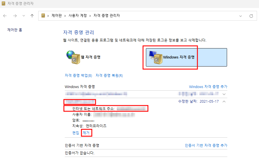 윈도우 > '자격 증명 관리자' 검색 후 실행